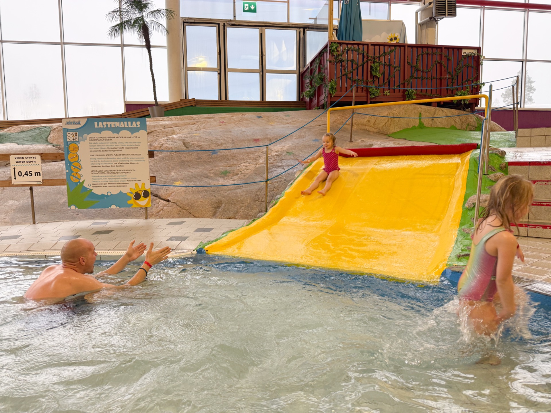 Olimme luulleet vesipuiston olevan vain kesäisin auki, joten yllätys oli suuri. Pojat kiersivät kaikki liukumäet ja löysivät suosikikseen Tornadon. Villivirta hurmasi, kioskilla pidettiin herkkuhetki ja pikkutytöt viihtyivät lasten altaissa ja liukumäissä. Välillä levättiin aurinkotuoleissa ja istuttiin saunan lauteilla.